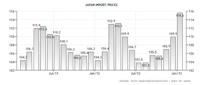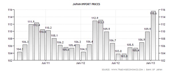 The Import of Goods and Services as a % of GDP averaged at 15% for Japan for the period 2008 - 2011, while the average is 21% for Australia during the same period (Source: World Bank). While Japan’s import of goods and service as a % of GDP fluctuates more and is relatively lower as a proportion of GDP; the magnitude of the depreciation for the Yen should nevertheless put some inflationary pressure on the Japanese economy. As the import price index has also risen in Japan (Source: tradingeconomics.com):